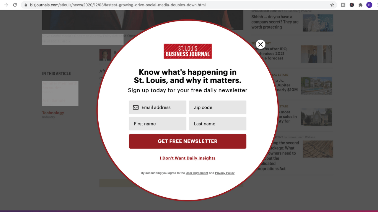 Last year I shared a St. Louis Business Journal story about the formation of Greater STL to my followers on LinkedIn. I am a subscriber to the paper and get there blast emails multiple times every day. But the problem was that when I shared it, everyone – including subscribers – got hit with their frustrating pay wall. It happens to me all the time even though I’m a subscriber. The screenshots I’ve shared are good examples because it almost always happens when I click some news story shared by someone else on LinkedIn.