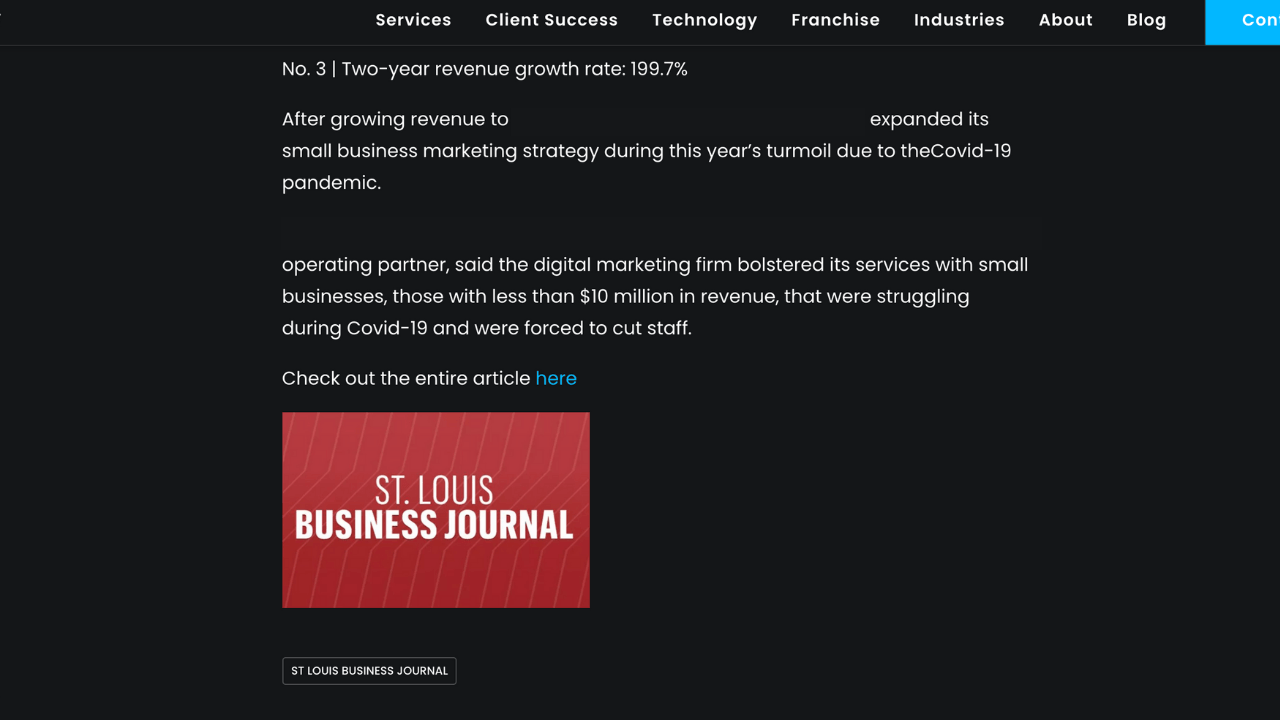 First of all, their most recent blog post was December 2020. Five months ago. It was a blog post with a link to an article in the local business journal. Here it is. I’ve redacted some of the key elements so they can remain anonymous.